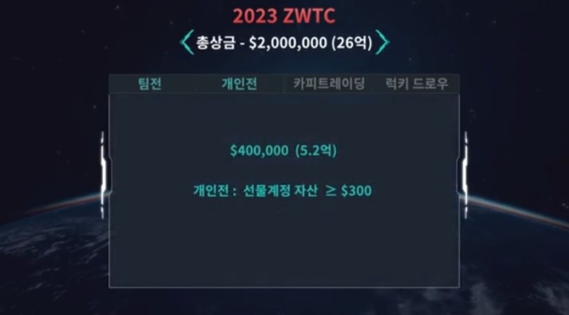 이번 대회는 팀전, 개인전, 카피트레이딩 전 3개와 모든 사용자가 참여할 수 있는 럭키드로가 있습니다.
