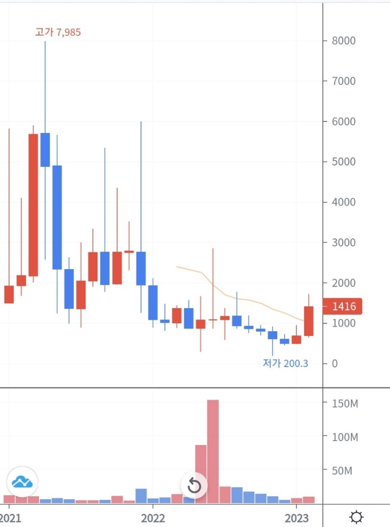 11월에 다시 시작된 하락세에 1월말 한때 1000원이 붕괴되었고 러시아-우크라이나 전쟁관련 국제적 불안감에 800원대까지 떨어진 이후에 계속 하락세를 유지하여 22년 12월 400원대까지 떨어졌습니다.