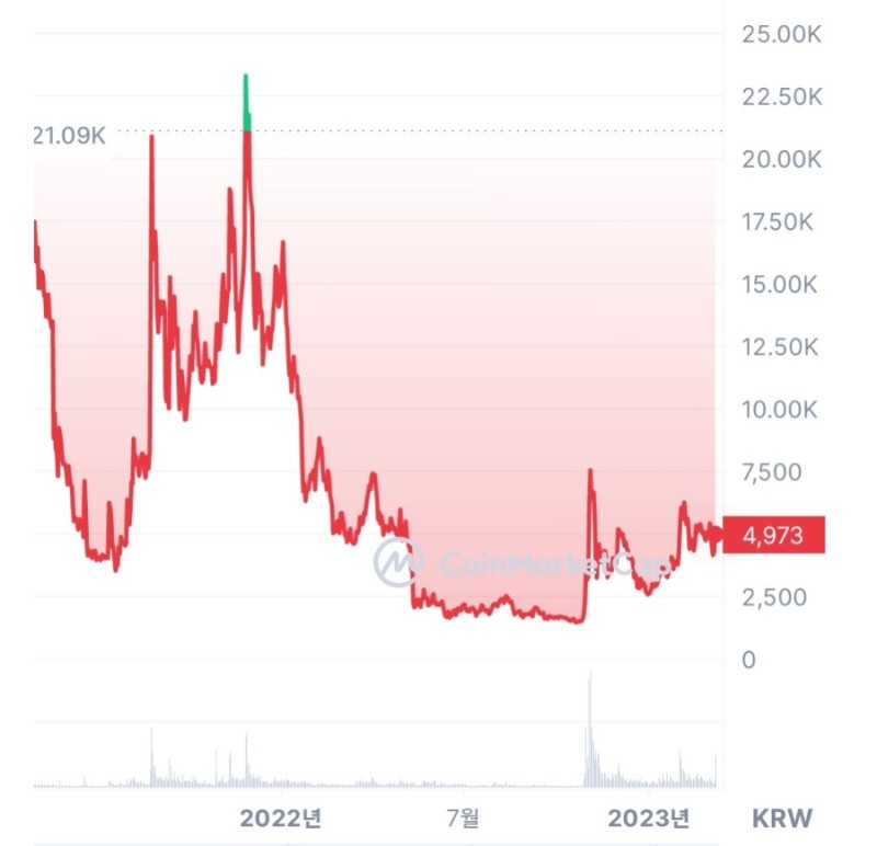 코인마켓캡 기준 마스크네트워크는 21년부터 시세 확인이 가능합니다. 21년 2만원을 넘겼던 시세가 21년12월부터 시작된 장기 하락장에 22년 중반한때 1,000원 아래까지 하락하였습니다. 그뒤 23년초부터 시작된 반등장에 2월초 6,500원까지 상승뒤 3월초 4,000원까지 하락하였다가 3월7일을 기점으로 5,400원을 돌파뒤 현재 5천원초반재 시세 형성중에 있습니다.